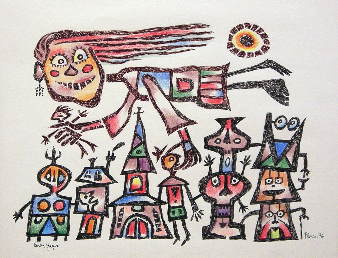 Baba Yaga, pen & ink and oil pastel on paper, 14″ x 16″, 1996. Previously unpublished and uncirculated late life work (two years before the artist’s death). Wiki entry profiles a dangerous damsel: