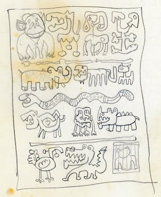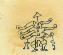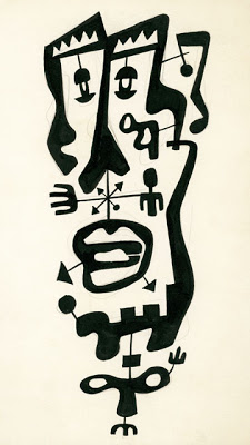 Pen drawing on onionskin paper with glue residue, early 1940s, from scrapbook. This freakish apparition has been blessed by the artist with bonus arms that appear to be appendages of his head, which has a stem on which to balance a coat hanger.