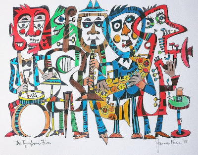We’ve come to a belated acceptance, and in some cases respect, for Flora’s late-life work. We still prefer the bizarre jaggedness of his 1940s and 1950s illustrations and paintings, but occasionally the old Jim peeks through the new. The Tympani Five (referring to Louis Jordan‘s fun-loving jump band of the 1940s) isn’t a top-tier work, but the spirit of Jordan synergizes with the spirit of Flora in this 1988 pen & ink with tempera on…