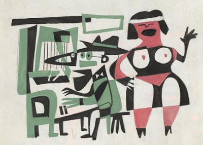 Here are two tempera illustrations discovered in an early- to mid-1960s sketchpad in the Flora collection. The more refined of the two works has a title: Bessie Smith, presumably a vignette of the soulful, bawdy 1920s and ’30s Empress of the Blues. The pianist (great hat!) is unidentified, and we can’t vouch for the historical accuracy of Smith performing with her nipples exposed: The second work, pages away in the same sketchpad, is untitled but…