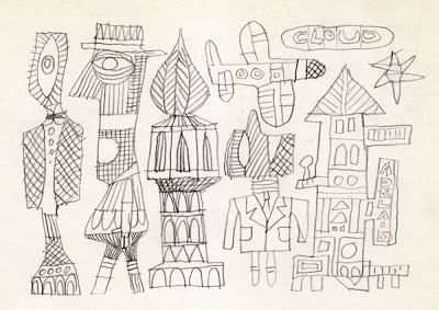 Pencil sketch from the mid-1990s of a cryptic tableau later rendered as a tempera on paper entitled Bijou. The painting retained most elements and positioning, with minor changes. The cloud was omitted, the plane enlarged, and the vertical theater marquee which reads “Adelaid” was renamed “Bijou.” The painting is unpublished and uncirculated, and will be reproduced in a future anthology.