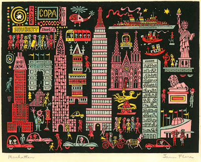 Jim Flora Art LLC has produced a limited-edition, archival-quality fine art print of a 1954 Jim Flora hand-tinted woodcut entitled Manhattan. The cityscape depicts New York in its 1950s glory, including a number of gotham landmarks such as the Empire State Building, St. Patrick’s Cathedral, Madison Square Garden, the Statue of Liberty, famous theaters and legendary musical bistros, Washington Square arch, subways, taxis, horse-drawn carriages and tourists. Only twenty-five (25) prints of Manhattan were produced…