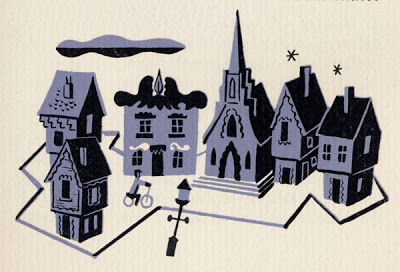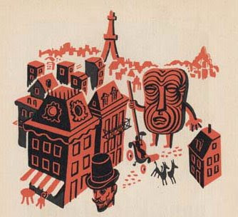 Paris had this unnamed gargantuan invader. In the foreground, a Van Dyke-bearded, top-hatted anatomical spare part flees from impending carnage, his method of self-propulsion unknown. Spot illustration, Columbia Coda, Nov-Dec. 1943, having something to do with composer Frederick Delius—but after reading the booklet’s accompanying text, we’re not certain what.