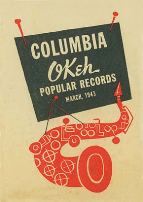 Cover, Columbia-Okeh Popular Records new release monthly, March 1943. (The sepia tint is an aging artifact.) Flora had designed these foldout booklets — covers and interiors — over the second half of 1942. Columbia appointed Flora art director, succeeding Alex Steinweiss, in late 1943, and he continued illustrating these monthlies through 1944. Three full 1942 spreads were reproduced in The Curiously Sinister Art of Jim Flora.