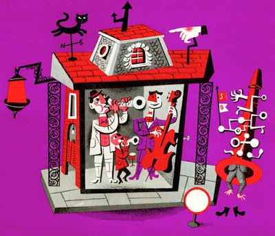 Now, as it did in 1943 when Flora provided this illustration for a Columbia Records magazine ad:The smiley flora has antecedents: Title page, Pip Pap Po, print from woodcut, Little Man Press (Cincinnati), 1940