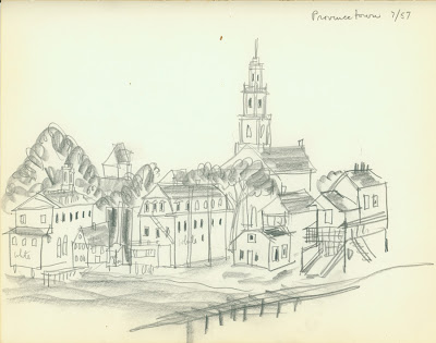 Pen & ink, 1992, discovered in sketchpad. Like most Flora works of the 1990s, this cityscape has never been published or publicly viewed.