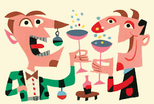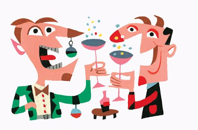 Detail, untitled holiday painting, ca. 1951. These stemware sophisticates also appear on a t-shirt Sketch, ca. 1951, featuring a draft of the celebratory duo