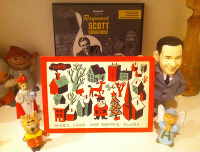We received a photo of this festive tableau from our good friend (and devoted Floraphile) in Japan, Takashi Okada. The greeting card, a vintage artifact ca. 1944, was purchased by Takashi from the Flora collection a few years ago. Behind the card sits a demo of Takashi’s forthcoming Raymond Scott Songbook, a 2-cd collection of rare Scott archival recordings and new cover versions by a variety of artists. Positioned to the right is a figurine…