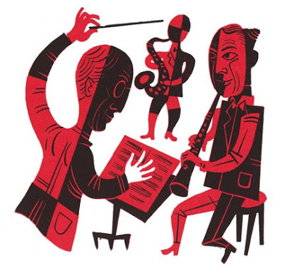 Jim Flora Art has launched a new limited edition fine art print: INSIDE SAUTER-FINEGAN, a 1954 RCA Victor LP that features one of Flora’s best-known cover illustrations. Eddie Sauter and Bill Finegan were famous for their orchestral mayhem. While Flora’s mischievous cover figures didn’t physically resemble Eddie or Bill, his caricatures reflected their inventive approach to redefining big band jazz in the 1950s. The print image is larger (15-1/2″ square) than the 12″ square LP….