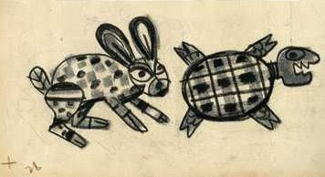 Not the artist’s title, but a descriptive one nevertheless:Detail from The Fabulous Firework Family (1955) first draft, a hand-drawn image from the Kerlan Collection, University of Minnesota. Oddly, these two critters had nothing to do with the story, and do not figure in the published edition. (Rumor has it they were dropped from the FFF project after a pay dispute.) They appear to be wearing costumes fashioned from tablecloth scraps.
