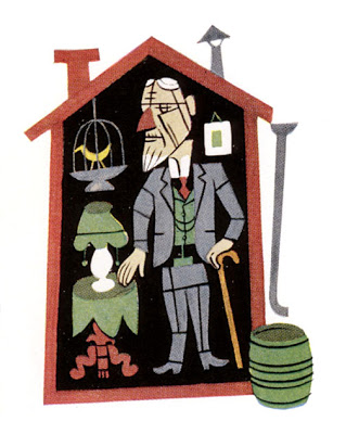 Detail from “Ohio,” full-page illustration commissioned by Container Corporation of America, 1947. The montage (fully reproduced in The Mischievous Art of Jim Flora, page 167) originally appeared in several nationally distributed magazines, including Fortune and Time. A detail previously posted here came from a scan of the magazine tearsheet. The above detail originated from a higher-resolution color print issued in 1948 by CCA. As their name implies, CCA manufactured containers. The one pictured in cross-section…