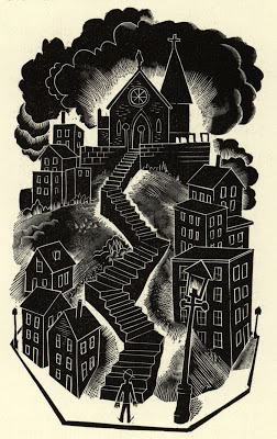 Mount Adams ascension, one of a series of woodcut prints the young Flora rendered for the Union Central Life Insurance Company of Cincinnati’s August 1941 publication, Life Association News. The images accompanied an article entitled “Where to go … What to do … While you’re in Cincinnati.” These woodcuts have not been republished since their first appearance seven decades ago. The location of the original wood blocks is unknown.