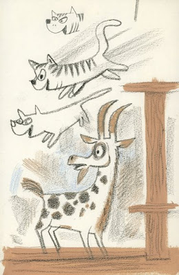 Draft illustration, The Day the Cow Sneezed (1957)Flora’s second children’s bookThat goat gets around.
