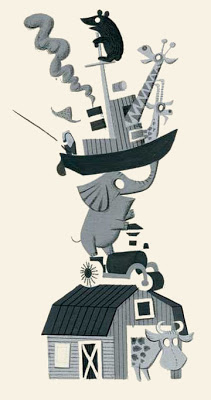 Spot illustration, dedication page, The Day the Cow Sneezed, now back in print thanks to Enchanted Lion Books. The first review—favorable!—courtesy the For Immediate Release (Kids) blog: I like his habit of calling attention to certain words by putting them in all caps, nearly on every page: POW! WHAMBO! and my personal favorite KA-BLOWIE-BLAM! I also enjoy the language he uses, specific phrases such as “scrunched as flat as corn flakes.” It’s just plain good…