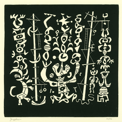 Jugglers, a 1957 Flora woodcut, was recently editioned at Yee-Haw Industrial Letterpress, in Knoxville. The 50 prints, struck from the original artist’s block, will be offered for sale by Jim Flora Art LLC in about a month. YH printed Railroad Town in 2006/2007, and plans to produce several more Flora relief prints over the next two years. A vintage artist’s print of this work was reproduced in The Curiously Sinister Art of Jim Flora.