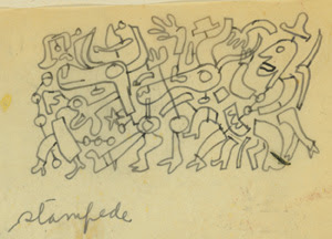 In late 2006, Joel discovered a number of his father’s sketchbooks in a trunk. Among them was a deteriorating scrapbook in which the artist had glued several hundred pen and pencil drawings from the early 1940s. One sketch depicts a rough outline of the above work, and supplies the title: