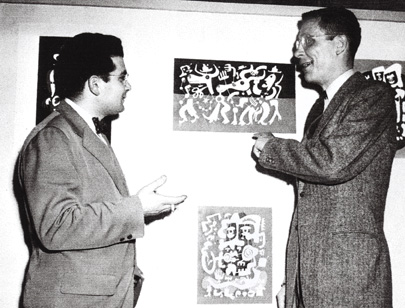 Thus began the archaeology, which continues to unearth ancient marvels. The above flashbulb-bleached vignette was snapped at A-D Gallery in June 1943 during Flora’s first NYC exhibit. Flora (R) is seen chatting with Alex Steinweiss, the man credited with (at least) two major artistic developments: 1) the invention of the illustrated record album cover (for Columbia, in 1938); and 2) the hiring of Jim Flora (also at Columbia, 1942). Flora’s quirky illustrations for the label’s ads and new release monthlies attracted enough attention in one year to warrant an exhibit at this very prestigious gallery.