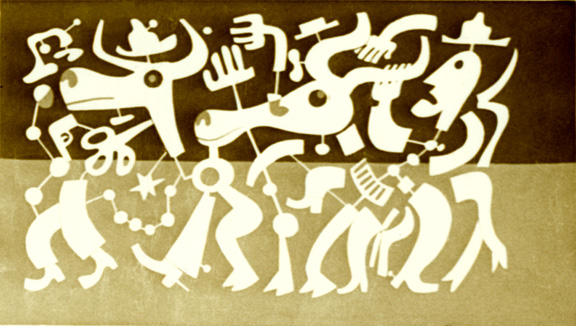 A procession of Calder-strung cowboys and cattle heads. The whereabouts of the work remains a mystery.