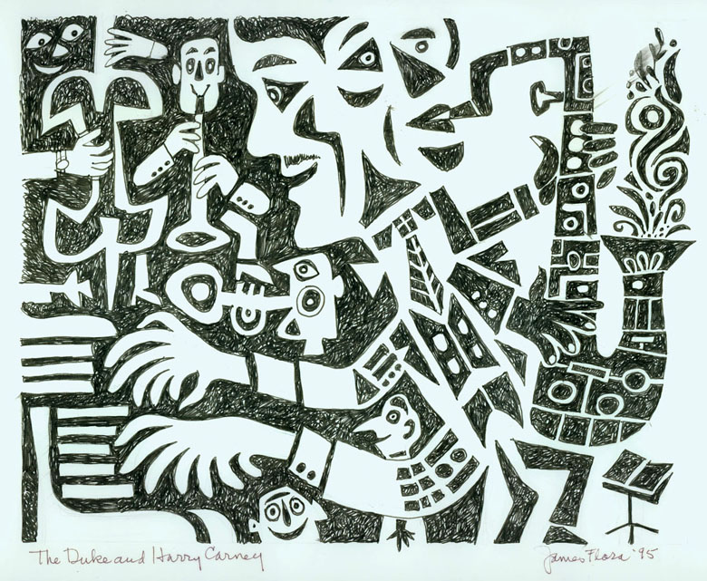Flora was an admitted “jazz hound.” He sketched, drew, painted and illustrated jazz musicians and scenes sporadically throughout his career, often as commercial assignments. However, in the final decade of his life, the retired artist devoted a considerable amount of creative energy drawing and painting portraits of musicians he admired from the 1920s through the 1960s. Scores—perhaps hundreds—of such works are in the Flora archives; most have never been publicly viewed.