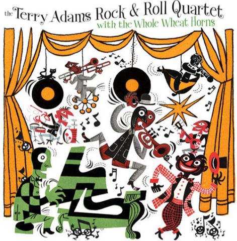 Just released by Euclid Records, a new 45 rpm single by Terry Adams & the Whole Wheat Horns whose sleeve features a Jim Flora musician montage. The chaotic combo, which incorporates cartoonish players from numerous Flora 1940s and 1950s sources, was created by Barbara Economon and yrs trly for our second book, The Curiously Sinister Art of Jim Flora.