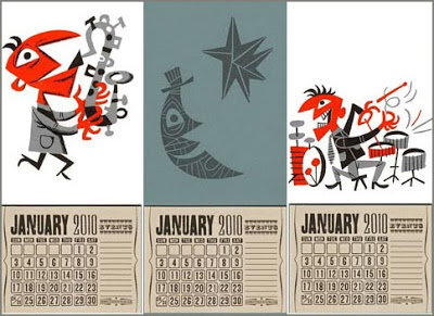 We’ve sold a bunch but they’re still in stock: 2010 Jim Flora calendars. The spunky hyperactive figures date from Flora’s mid-1950s RCA Victor LP period. Each calendar is letterpress printed one color at a time on card stock, and accessorized with a 12-month tearaway calendar. Buy one ($12.50) or a set of three at the Little Shop of Flora’s. These keepsake datekeepers were produced by Yee-Haw Industries, of Knoxville.