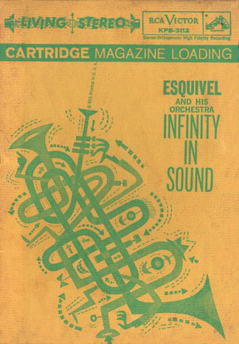 Almost. The Flora pretzel-ized trumpet that graces the cover of this rare RCA Victor Living Stereo “cartridge magazine” originally appeared in 1958 on the back cover of the LP Portrait of Shorty Rogers. The illustration was recycled by RCA Victor’s art department on this 1960 Esquivel package, whose format was the (failed) forerunner of the cassette.