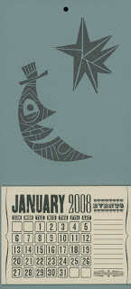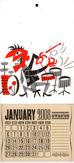 Jim Flora Art LLC is offering three hand-printed 2008 calendars: swingin’ sax, boogie-beat drummer, and starlite moon. We have a limited number (30 each) to sell. That’s it. It’s not a numbered edition — 500 backing cards each were printed by Yee-Haw Industries (Knoxville), but due to scheduling demands, the production team could only finish a few hundred calendars for retail boutiques. JFA LLC received 30 sets for our customers.