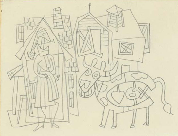Or perhaps she’s just contented. Early pencil sketch, ca. 1940. There are a number of pencil and pen sketches in the archives which evolved through stages into paintings . This, so far as we know, isn’t one.
