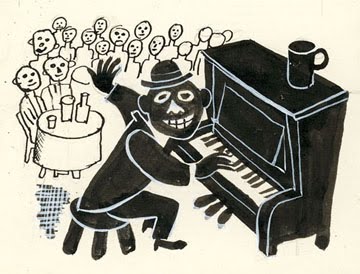 A draft and a refinement of a common theme. This barrelhouse piano player was roughly rendered for a series of demo booklets the Cincinnati-based Flora crafted in 1941 as a job pitch: