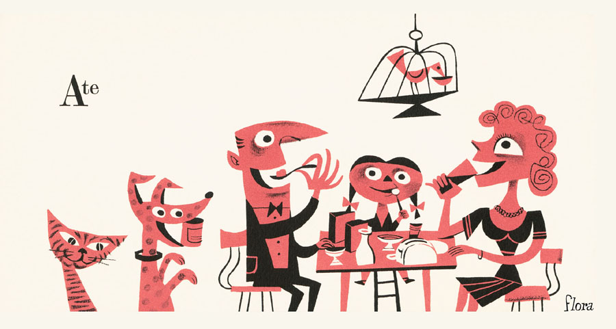 Subtitled “A Flora ’50s A-B-C,” the images derive from a 1954 trade-only alphabet booklet titled Primer for Prophets that Flora illustrated for CBS-TV. The booklet was not circulated to the public, but was intended to attract corporate advertisers to the emerging medium of television. Each page featured iconic Flora illustrations of past-tense verbs (A to Z) that reflected daily activities of the typical American family, suggesting products they would purchase.