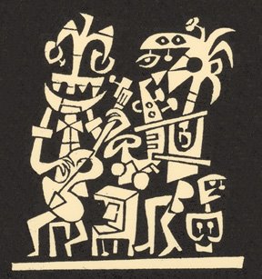 Detail, Railroad Town, 1951 woodcut. The work in its entirety will be featured with commentary and photos of the original block in our forthcoming book, The Sweetly Diabolic Art of Jim Flora, scheduled for September 2009 publication. Limited edition oil prints struck from the artist’s block are available.