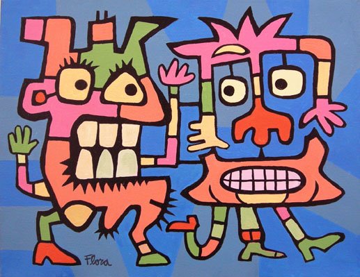 Two characters, five legs. This acrylic on canvas (15-3/4″ x 20″, late 1990s) almost made it into our forthcoming book, but was edged out by a plethora of prominent works. Flora produced some interesting, mystifying paintings in his final decade (after, by his own admission, “painting myself out of boats” in the late 1980s). Above is a low-grade snapshot corrected in Photoshop; the recently discovered work has not yet been professionally documented.