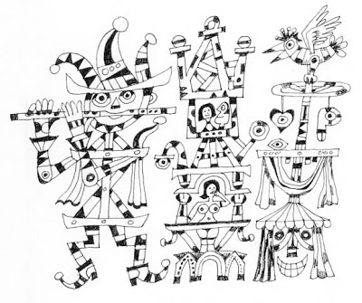 Pencil sketches for Till Eulenspiegel LP cover, 1955. The above skeletal figures eventually morphed into this rough layout: