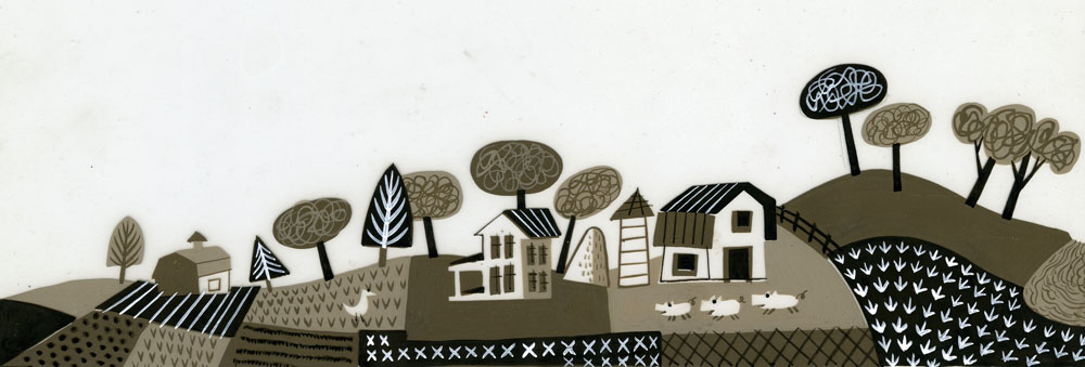 Farm scene draft for The Day the Cow Sneezed (1957), Flora’s second children’s book. The landscape image is one of 80 scans Barbara and I recently acquired from the Kerlan Collection at the University of Minnesota. We plan to reproduce a number of these early work pages in our third book of Floriana, currently being compiled and written.