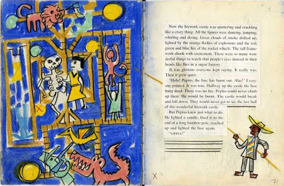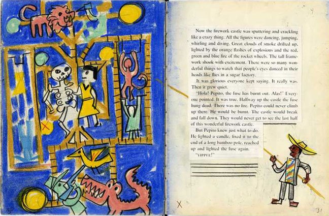Among the artifacts — donated to the University by the artist — was an eye-popping version of Flora’s first children’s book, The Fabulous Firework Family (1955). At first glance, we thought it was a badly preserved first edition because the pages were detached and stuffed between covers. Upon closer inspection, we discovered that Flora had reconstructed the book by sequencing his original drafts of each page, which were rendered on various types of paper in pencil, pen and watercolor. He then trimmed text sections from a printed edition and glued them in position on each page.